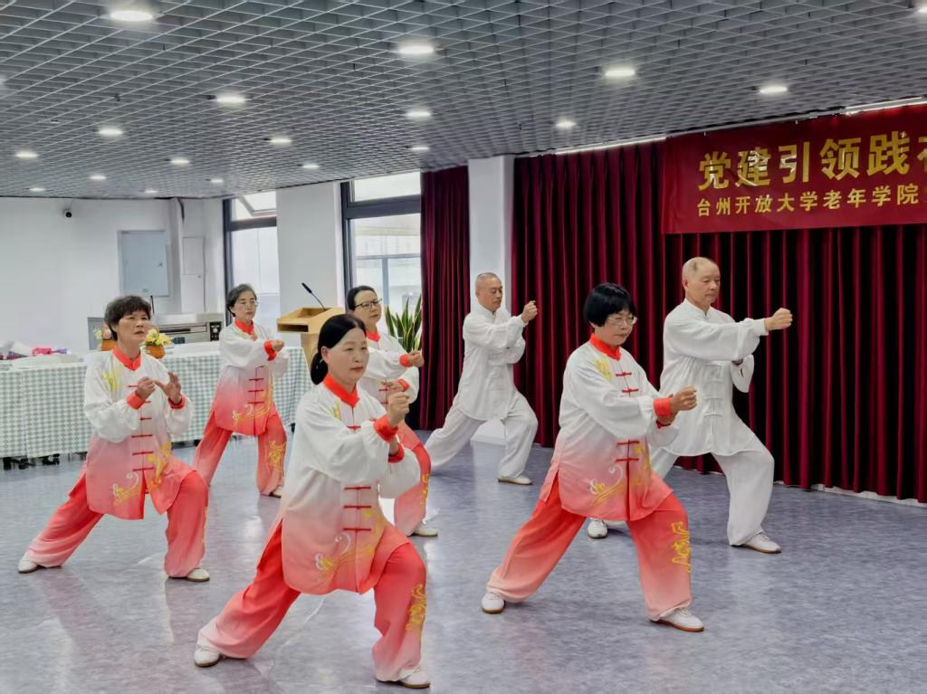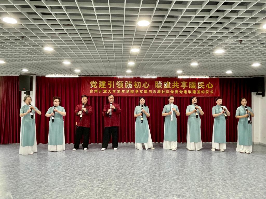 签约仪式后,台州开放大学银龄学员以精湛才艺展示“老有所乐”的精神风貌。电吹管班学员以激昂的一曲《沧海一声笑》演绎出江湖豪情,展现“活到老学到老”的进取精神;乐龄旗袍班学员身着锦绣华服,在《妈妈教我一支歌》的旋律中,以优雅台步串联红色记忆与东方美学;太极拳班学员用行云流水般的杨式四十式套路将“外练筋骨、内养心神”的传统智慧娓娓道来;还有学员以清丽唱腔演绎越剧《穆桂英挂帅》,重现巾帼传奇,引得台下观众的掌声与喝彩声此起彼伏。